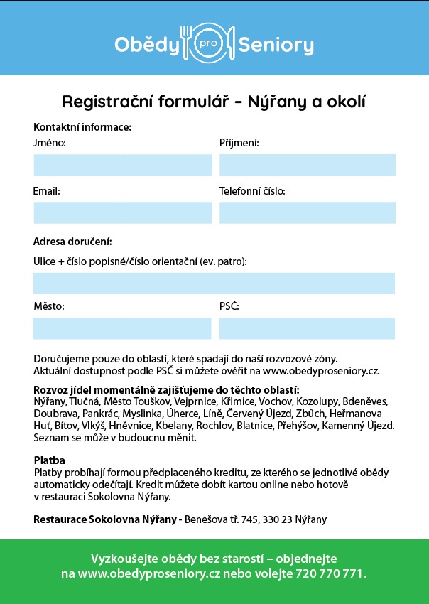Nabízíme obědy pro seniory v Nýřanech a okolí, které jsou uvařeny s láskou a doručovány bezpečně až ke dveřím. Můžete si vybírat z pestrého menu, které zahrnuje pět hlavních jídel každý den. Obědy si můžete objednat pravidelně nebo jen občas, a to dokonce i na několik týdnů dopředu. Registrace je jednoduchá a probíhá online, nebo můžete využít tištěný formulář. Pro více informací a registraci navštivte naše webové stránky nebo se zastavte v restauraci Sokolovna Nýřany.